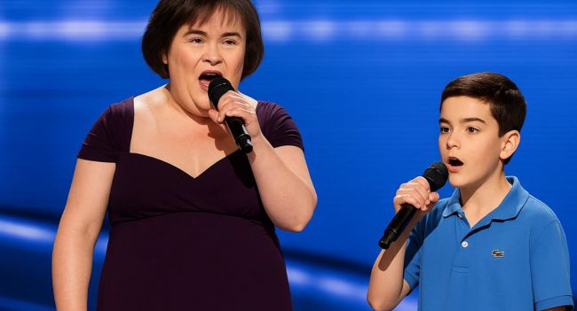 “Dad… I’m singing with her?!” Susan Boyle Brings Simon Cowell to Tears in Magical Duet With His Son! In a jaw-dropping twist no one expected, Susan Boyle stepped onto the Britain’s Got Talent stage alongside Eric Cowell, Simon Cowell’s young son, delivering a duet that left the audience breathless. Their voices intertwined perfectly, blending Susan’s soulful power with Eric’s tender innocence to create a harmony that felt lifted straight from a storybook. Cameras captured Simon’s reaction—eyes glistening, emotions raw—as he watched his son share the stage with a musical legend. What began as a regular episode transformed into a historic television moment, a once-in-a-lifetime memory of music, legacy, and pure heart. Fans flooded social media, calling it a performance that will be remembered forever.